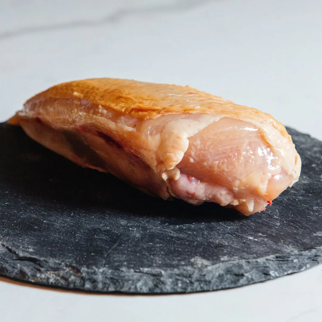 Seleccionamos las pechugas, que cortamos para cocinarlas cómodamente. Pollo de corral, bien cuidado y criado totalmente al aire libre, sin prisas y alimentado principalmente con maíz. Su carne es muy sabrosa y melosa.