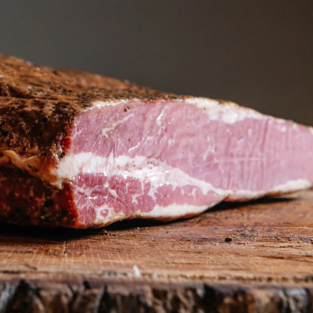 Ideal para comerlo frío o en bocadillos. La textura de este pastrami es carnosa y se complementa con intensos matices de ahumado y un toque característico de pimienta. Es la pieza más gustosa de nuestra gama.