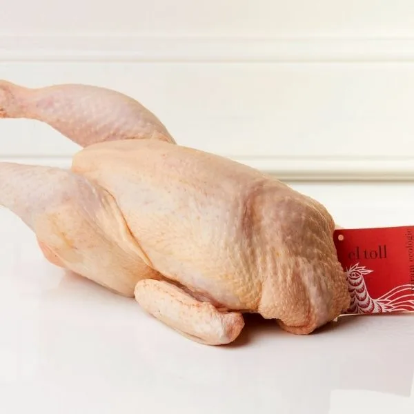 Criado en libertad en la granja del Toll, ubicada al pie del Cim d’Àguiles en Moià. Este pollo de raza empordanesa se alimenta exclusivamente con productos ecológicos. Su carne, suave y delicada, ofrece un sabor auténtico y natural.